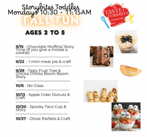 Spooky flatbread Pizza making. Monster smoothie. Interactive story time and game. Monster wiggle and parade. Costumers welcomed.