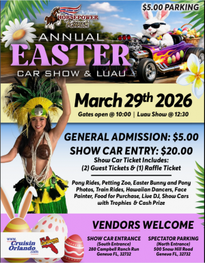 2026 Annual Easter Car Show & Luau Fun for the Whole Family Spend the day enjoying: Pony Rides Petting Zoo Easter Bunny & Pony Photo ...