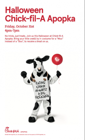 Eat & Treat featuring our Chick-fil-A cow! Happening October 31st from 5-7pm! Get a free kids meal for children 12 & ...