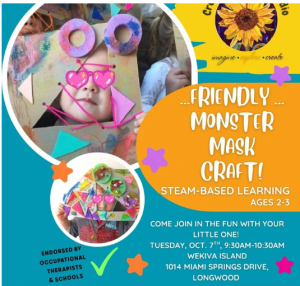 FRIENDLY MONSTER MASK CRAFT! CALLING ALL TINY EXPLORERS 2-3 YEAR OLDS! Come explore textures and color and create a fun-loving, ...